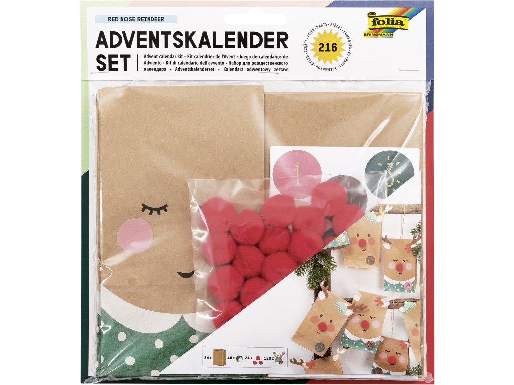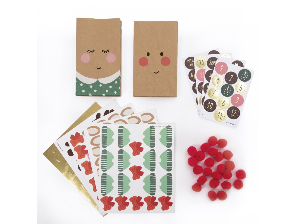 Adventní kalendář - set - s papírovými sáčky. Velmi pěkně zpracovaný adventní kalendář. Balení: 216 dílů 24 papírových sáčků - 10 x 5,5 x 17,5 cm - 2 motivy samolepky - 48 ks červené nosy (bambulky) - 24 ks 120 ks výseků např. růžky... bezpečné pro potravinyDoplňkové parametry