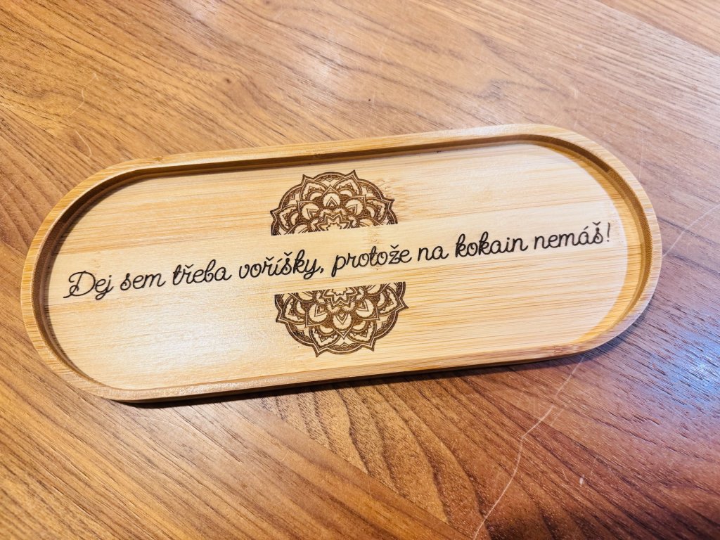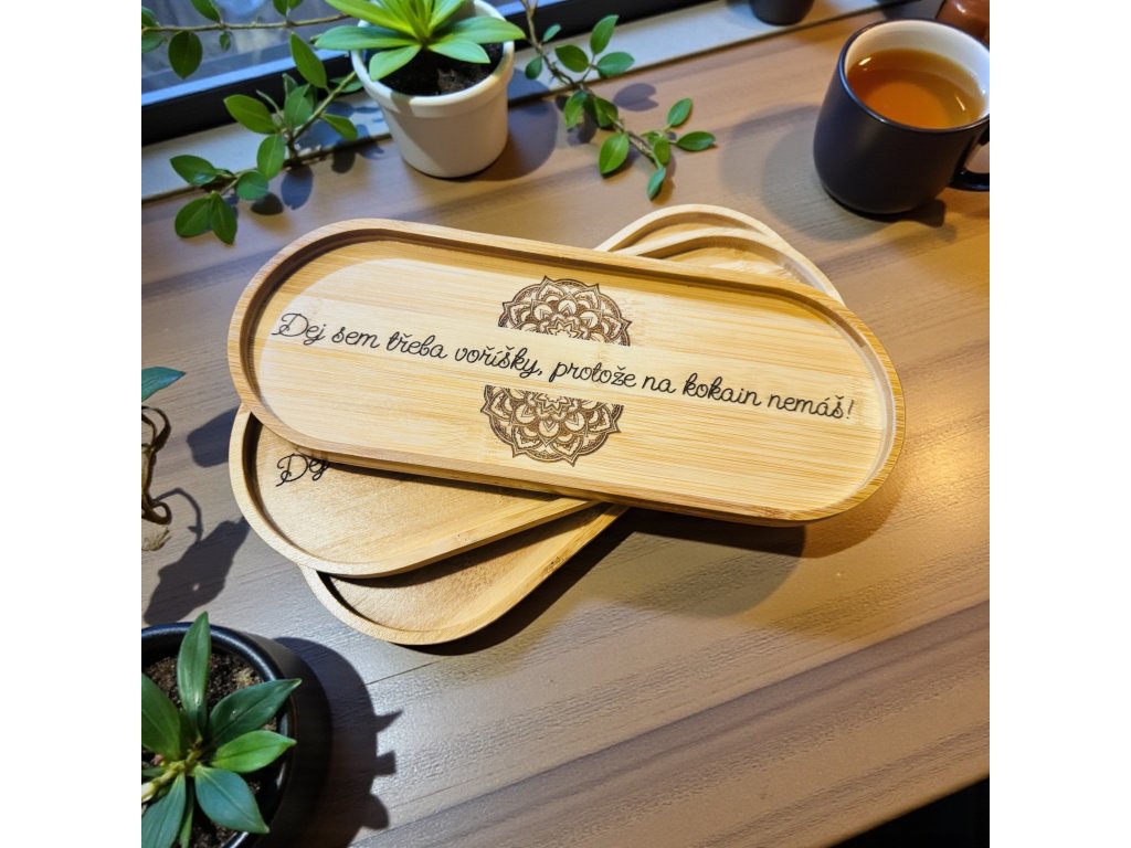 Vyrobený z přírodního bambusu, s jemným gravírovaným ornamentem uprostřed, který dodává produktu lehce zenový klid – aby ten humor nebyl úplně bez zábran. Hodí se do obýváku, na barový stolek i jako originální dárek pro kamaráda, který má smysl pro humor (a realitu).