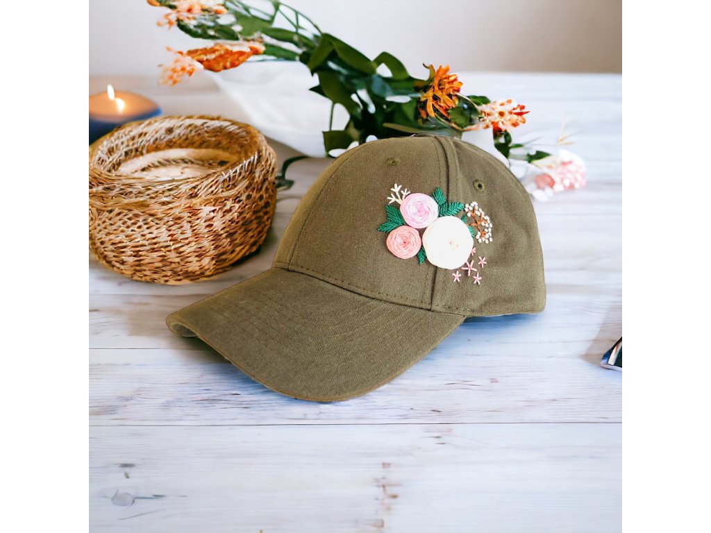 Bavlněná kšiltovka s vyšívanými květinami - khaki