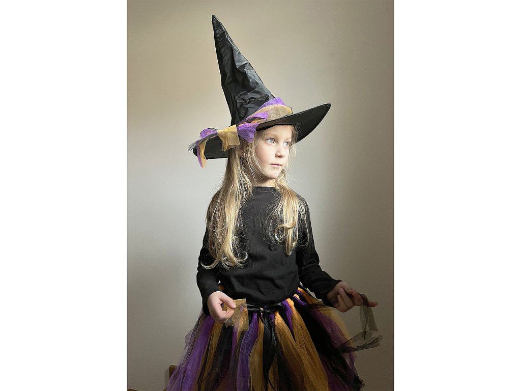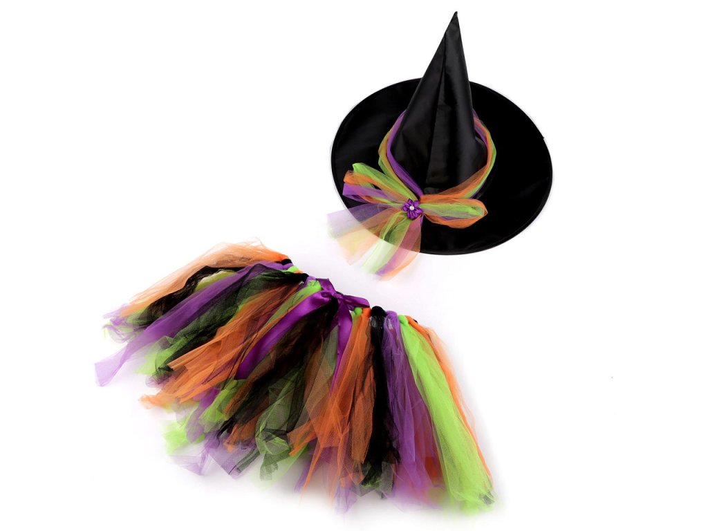 Dětský čarodějnický karnevalový kostým se skládá z klobouku a tylové sukně. Klobouk dobře drží tvar a je ozdobený tylem.Rozměry klobouku: