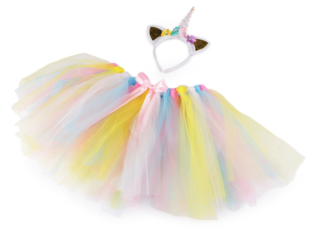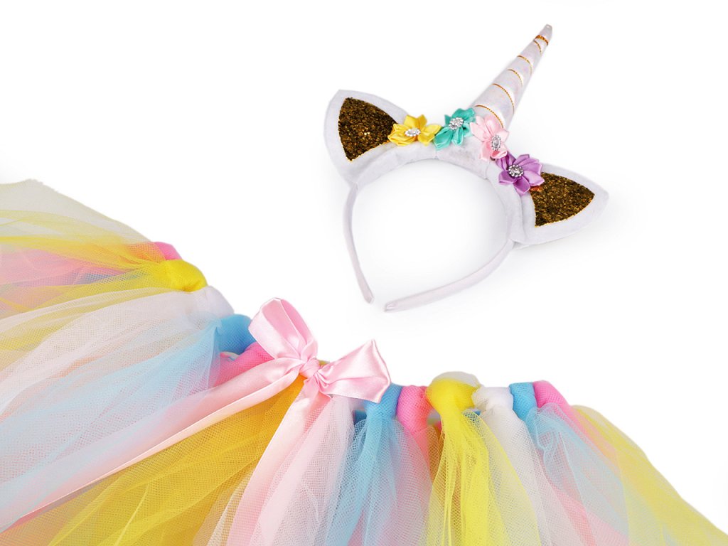 Originální kostým jednorožce si zamilují všechny malé slečny. Skládá se z barevné tylové sukýnky a čelenky, na které je efektní roh, uši s glitry a textilní květy.Délka sukně je cca 28 cm, její obvod 52 - 80 cm.