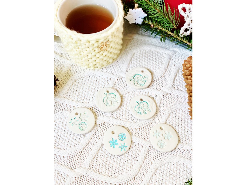 Keramické jmenovky na dárky - sněhuláci a vločky 6 ks