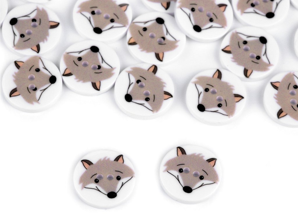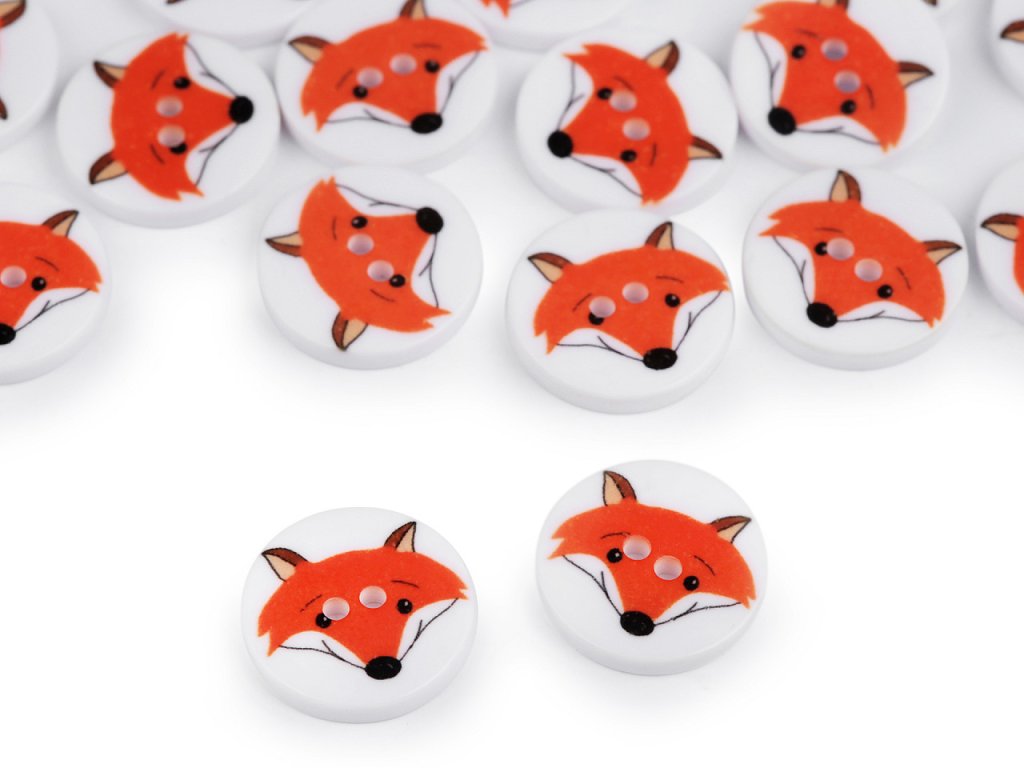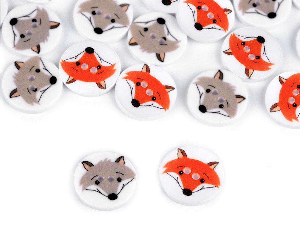 Dvoudírkové knoflíky s liškou vyniknou na dětském oblečení i doplňcích. Jsou vhodné i na dekorace a quiet booky (šité knihy).Mají atestaci Oeko-tex.