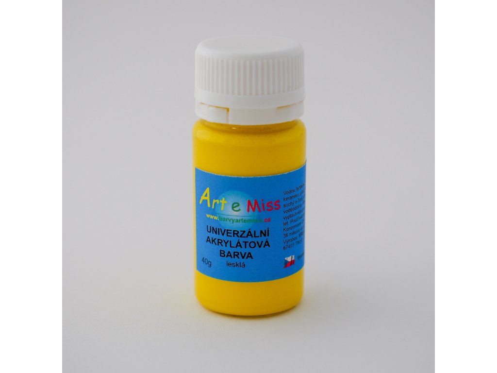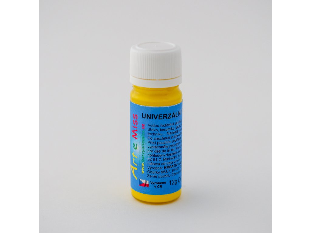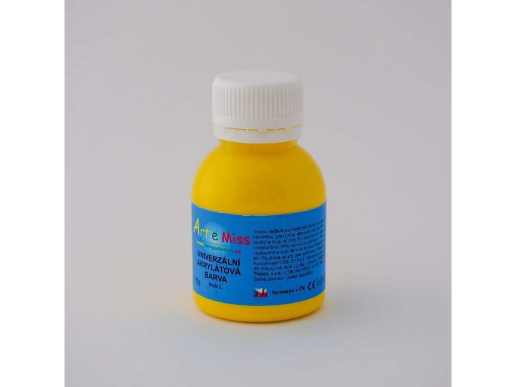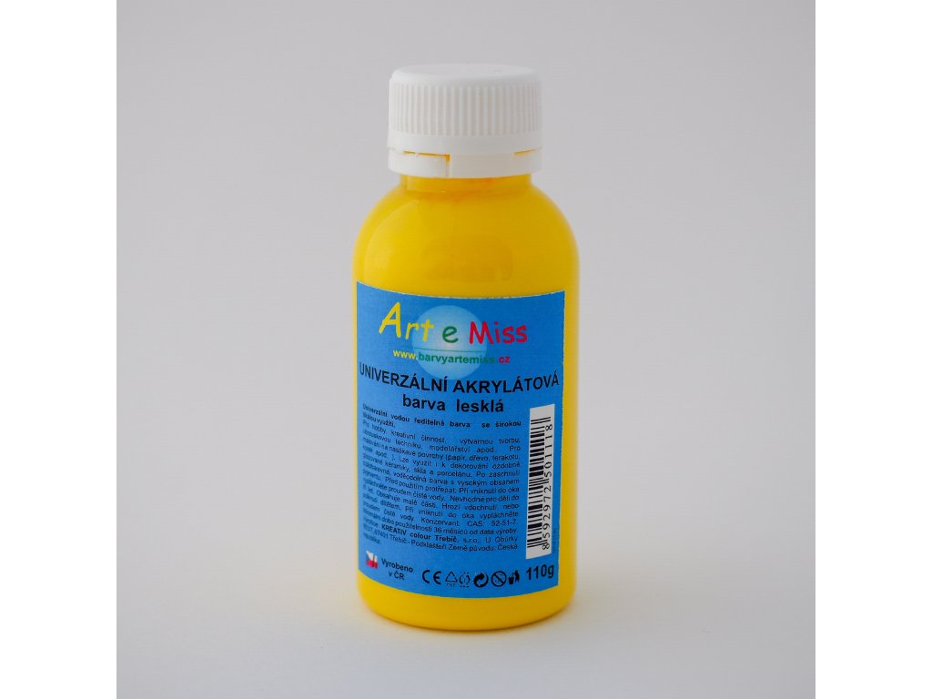 Akrylátová barva (akrylka, acryl) na většinu povrchů kromě textilu.Hodí se pro hobby, kreativní činnost, výtvarnou tvorbu, ubrouskovou techniku, modelářství, kamínky...Můžete ji použít venku i v interiéru.Nejlépe drží na nasákavých površích jako je dřevo, karton, papír, terakota, korek, beton, neglazovaná keramika a podobně. Na hladké, nenasákavé povrchy například sklo, porcelán či kov ji můžete použít jen tam, kde nebude nátěr příliš namáhán vlhkem nebo mechanicky. V tomto případě je lepší použít vypalovací barvu.Obsahuje jasné stálobarevné pigmenty. Po zaschnutí je nátěr lesklý a voděodolný. Barevné odstíny jsou výraznější než u matných barev, ale o něco méně kryjí. Je vodou ředitelná, to znamená, že na čištění pomůcek po použití stačí obyčejná voda, ale pouze do chvíle než barva zaschne. Zaschlou barvu lze z některých povrchů vyčistit lihem. Pracovní postup: Před použitím lahvičku protřepejte nebo promíchejte. Na čistý a suchý povrch naneste barvu a nechte dobře zaschnout. Pokud je potřeba aplikujte druhou vrstvu. Z 1kg barvy natřete 6-10m2, ale záleží na nasákavosti povrchu. Odstíny můžete libovolně míchat. Tip: Univerzální barvu můžete použít k tónování malířských akrylátových barev. Skladování: Skladujte v dobře uzavřených obalech, při pokojové teplotě. Zabraňte přímému slunečnímu svitu a vysokým teplotám. Nesmí zmrznout. Rozvrstvení barvy při delším skladování není na závadu.Doplňkové parametry