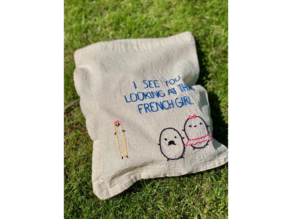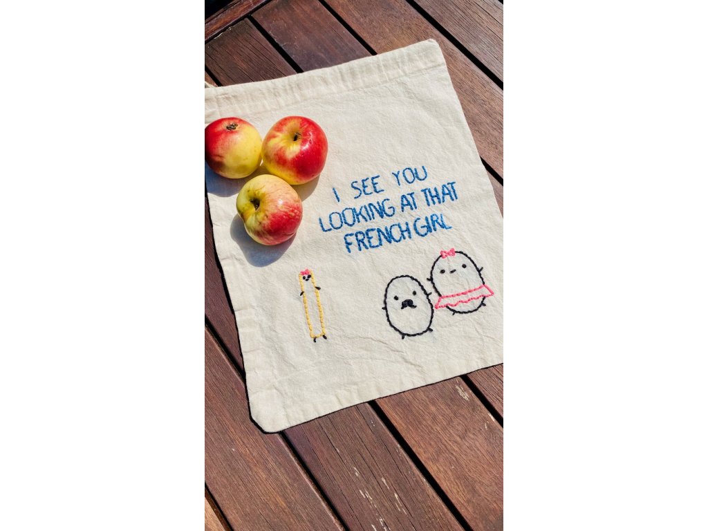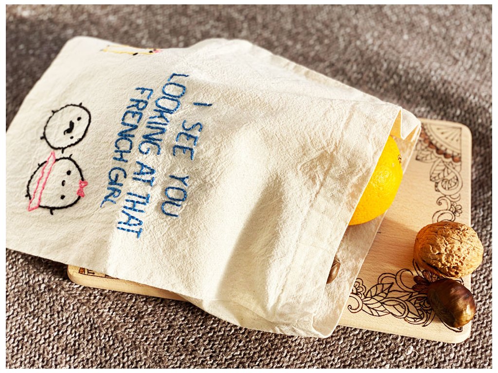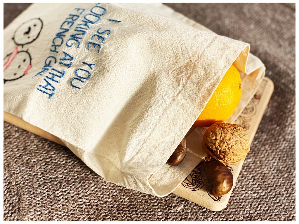 Když na nákupy, tak s vlastním sáčkem na zeleninu, ovoce, oříšky, pečivo a dalších asi milion věcí, co nechcete vkládat do igelitových sáčků. Ve znamení Zero Waste je tu i tento lněný sáček s uzavírací tkaničkou a vtipnou ruční výšivkou. \n \nSáček je opatřen bavlněnou šňůrkou na stažení a jezdcem na uzavření. \n \nMateriál: 50% len, 50% bavlna \n \nRozměry: 25 x 31 cm \n \nÚdržba: perte v pračce, dle uvážení a potřeby, výšivka se poškodí běžným opotřebením