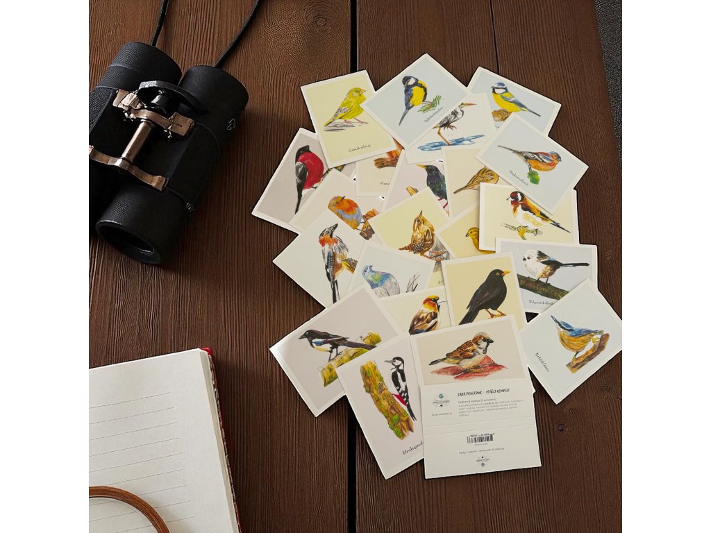 22 ručně kreslených a malovaných ptáčků na prémiovém papíře s jemnou texturou. Mezi ptáčky naleznete červenku, pěnkavu, kosa, holuba, strnada, vrabce domácího i polního, sýkorky koňadru i modřinku, z lesa poté brhlíka lesního, strakapouda velkého a nezbednou veverku, která stále ráda okupuje mnohá krmítka, ale i straku a ohroženého zvonka zeleného. Každá pohlednice má na zadní straně informace o konkrétním ptáčkovi a prostor pro váš pozdrav.
