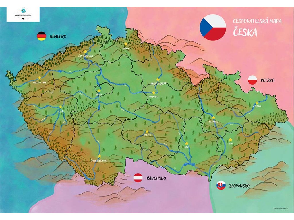 Kromě krajských měst, krajiny a pohoří jsme dokreslili do mapy i naše hlavní řeky. Je velmi zábavné ukazovat dětem, kde jsme vlastně v těch Čechách byli a sami jsme překvapeni tím, jak znají všechna ta úžasná místa, ale netuší, kde se nacházejí na mapě nebo v kterém kraji.