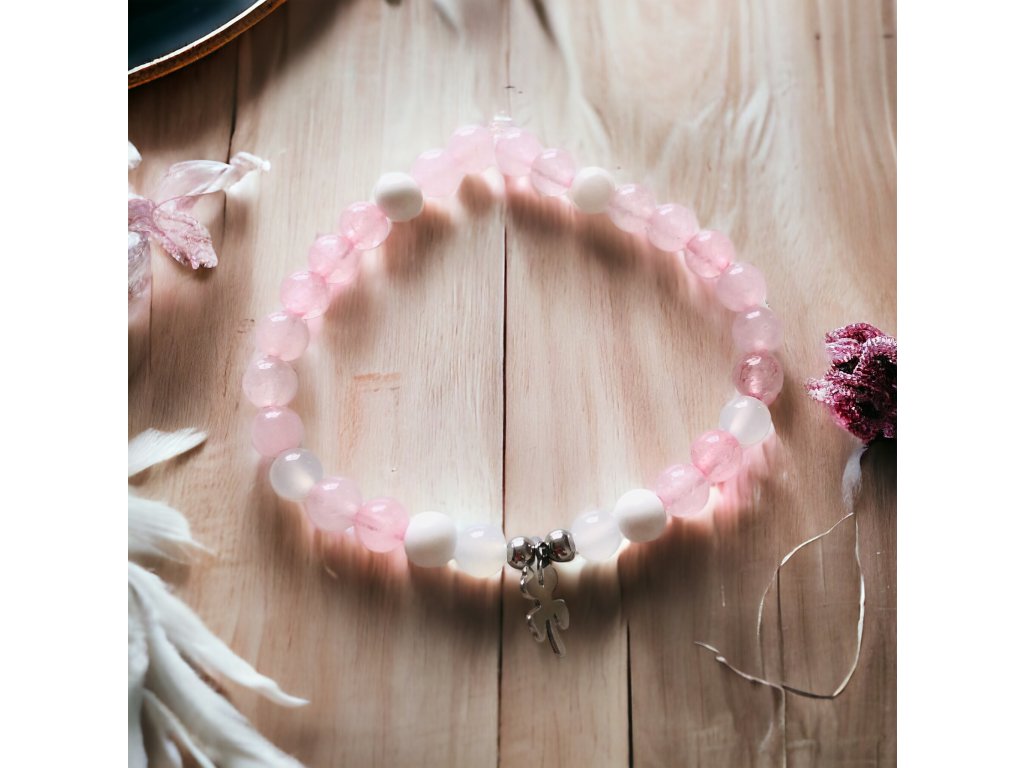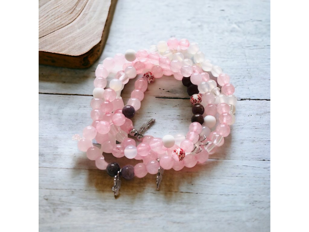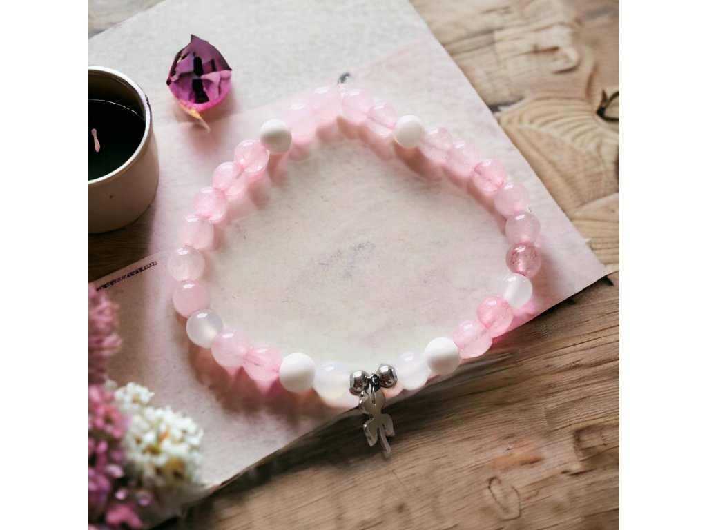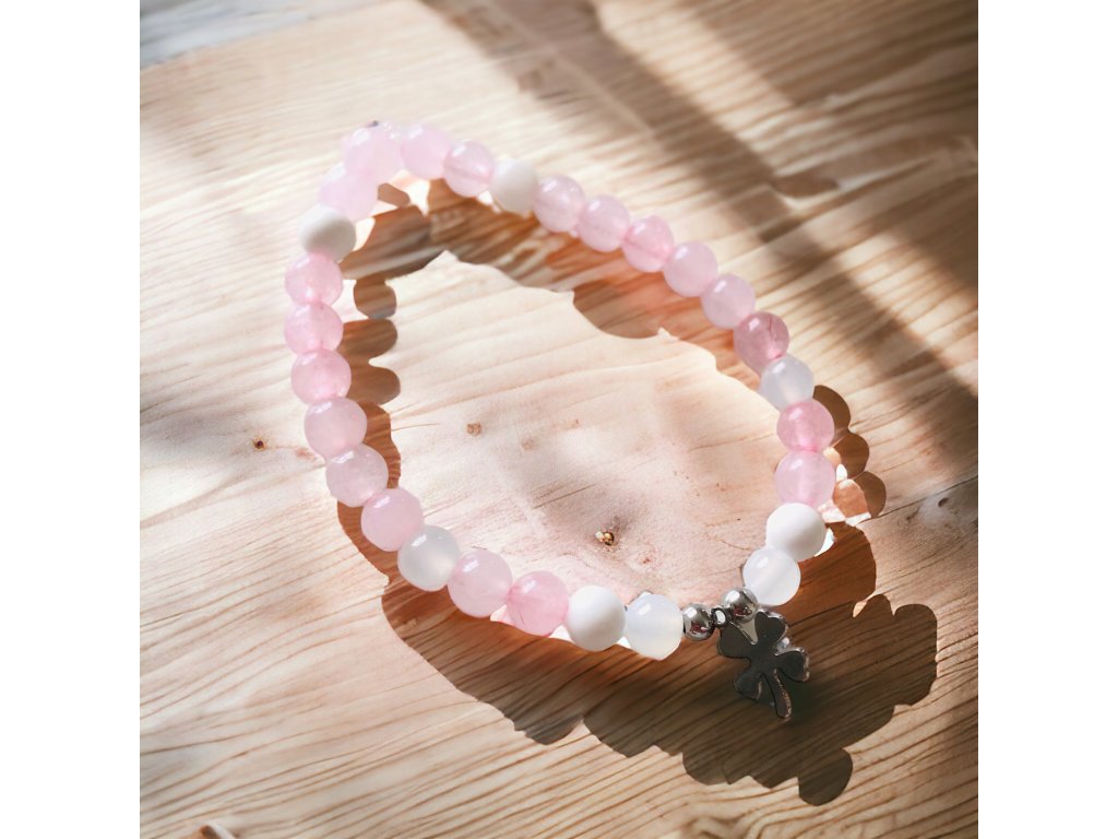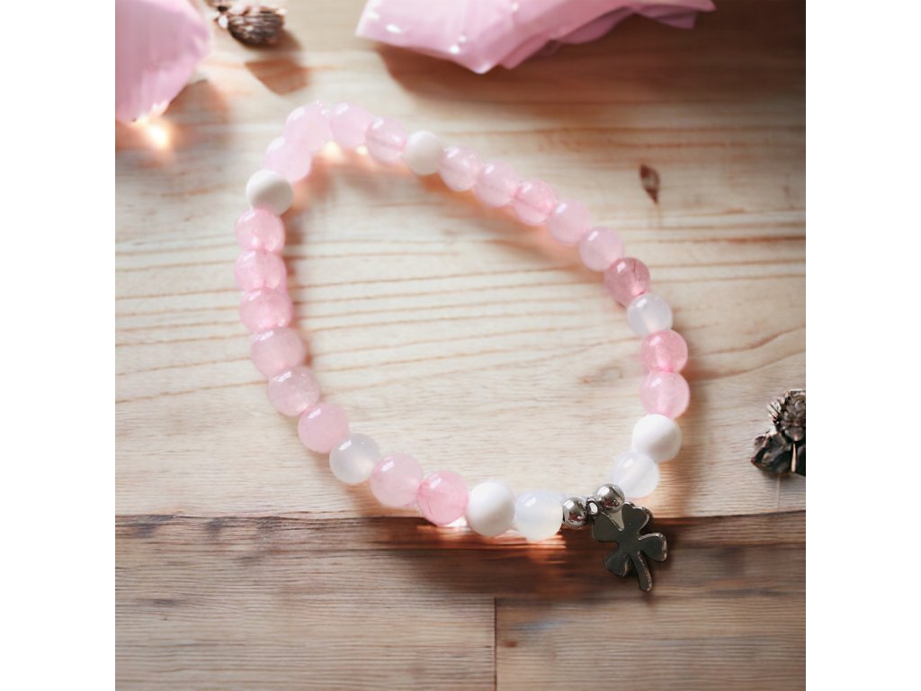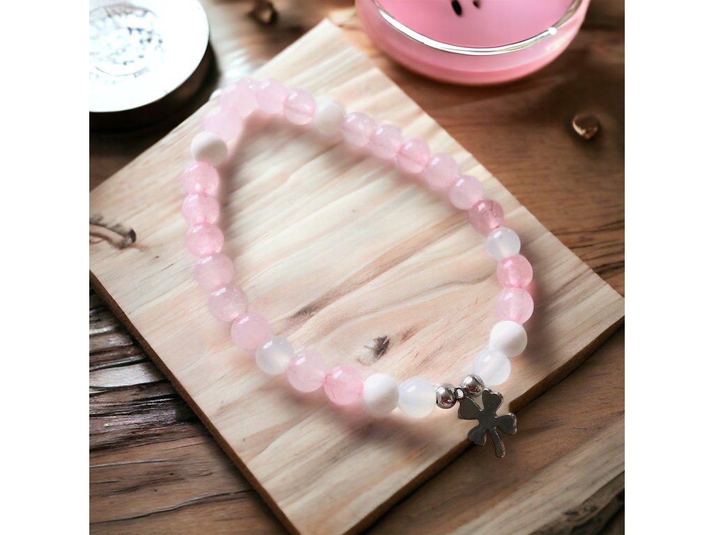 Minerální náramek z milovaného růženínu a jemných kamenů křišťálu a achátu je originálním amuletem se záměrem. Zdobený je čtyřlístkem pro štěstí.