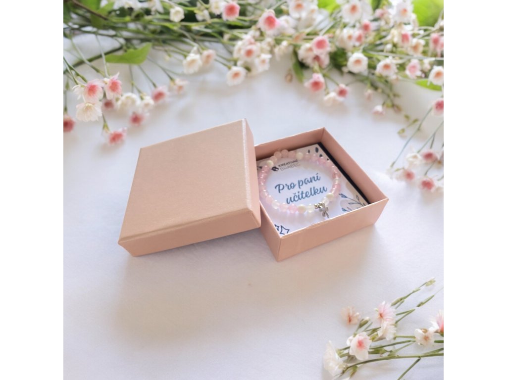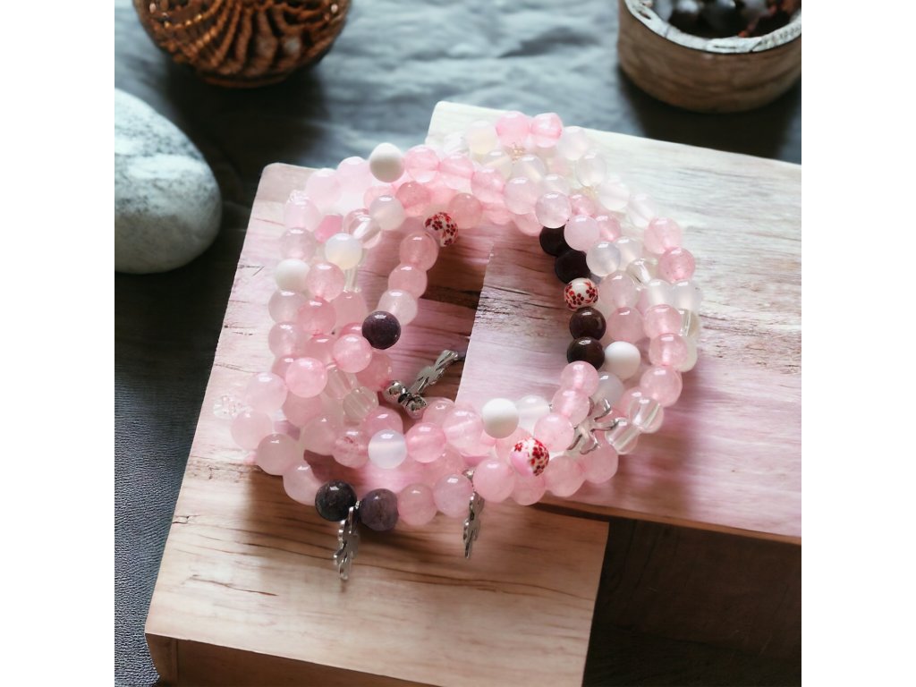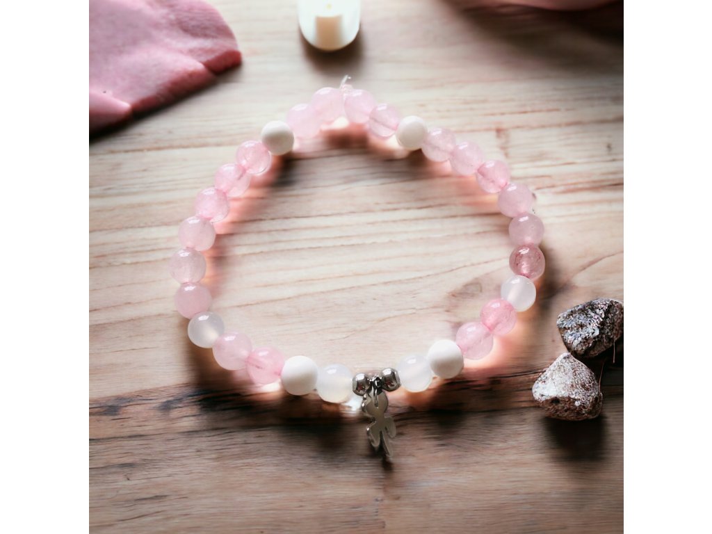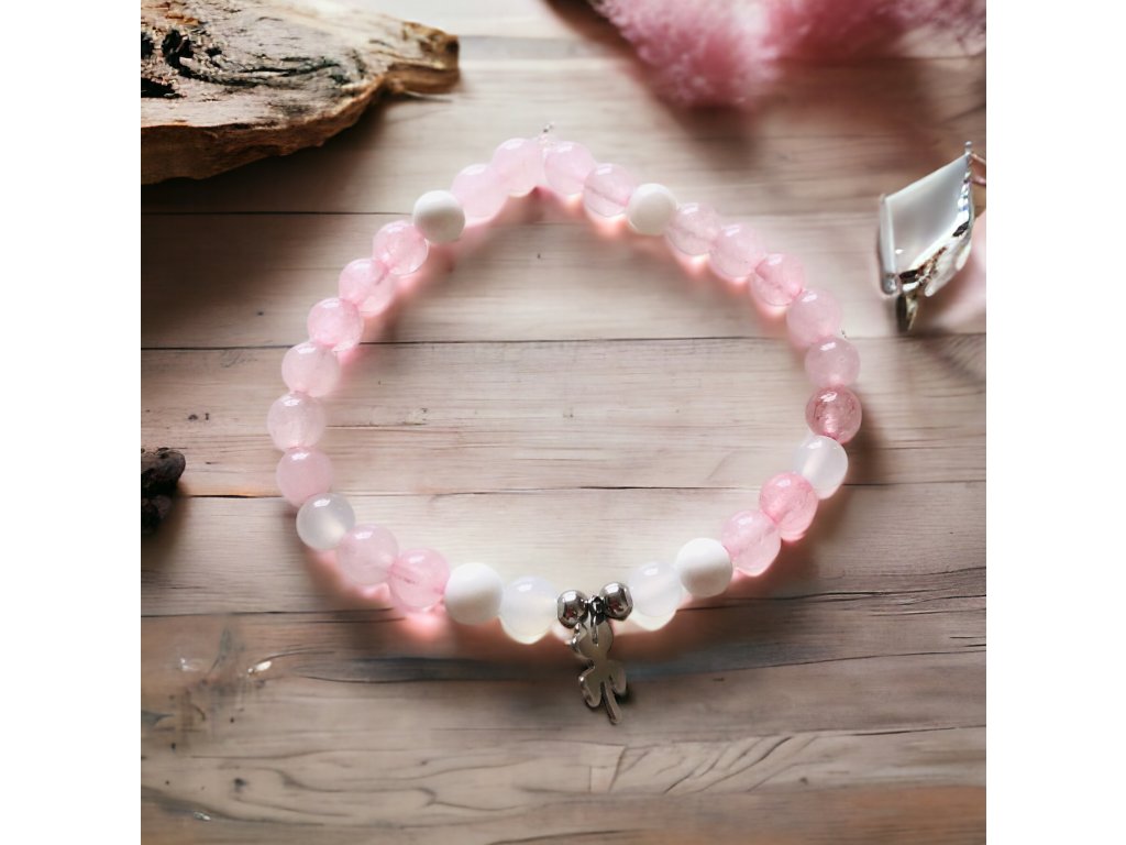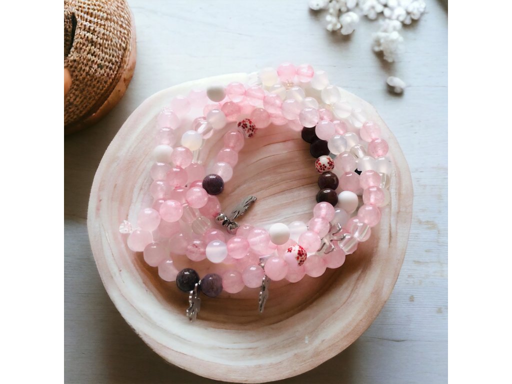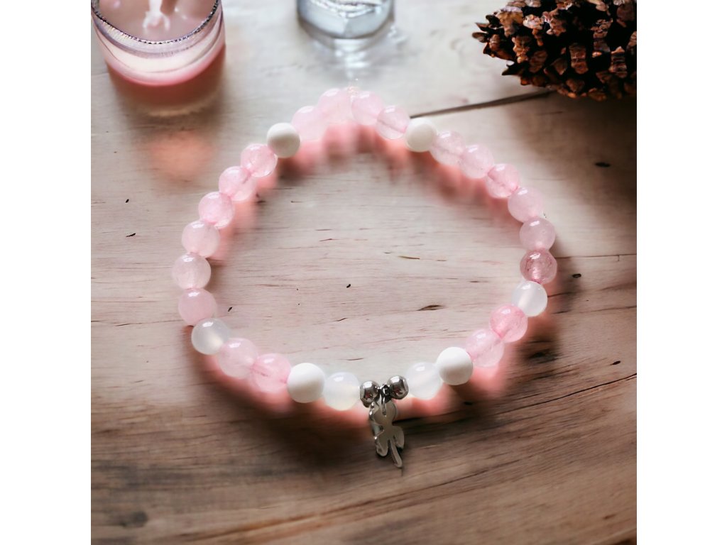 Minerální náramek z milovaného růženínu a jemných kamenů křišťálu a achátu je originálním amuletem se záměrem. Zdobený je čtyřlístkem pro štěstí.