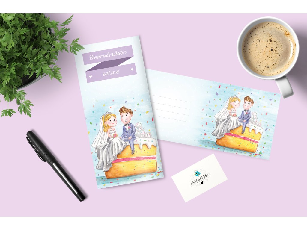 Ručně malované přáníčko ke svatbě. Tištěno na kreativním papíře s barevnou obálkou ve velikosti 15 x 15 cm.
