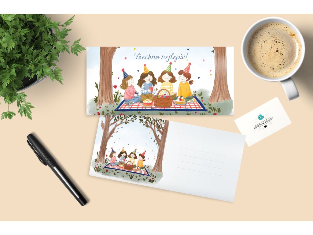 Ručně malované přáníčko k narozeninám. Tištěno na hladkém papíře s hnědou kraft obálkou ve velikosti 15 x 15 cm.