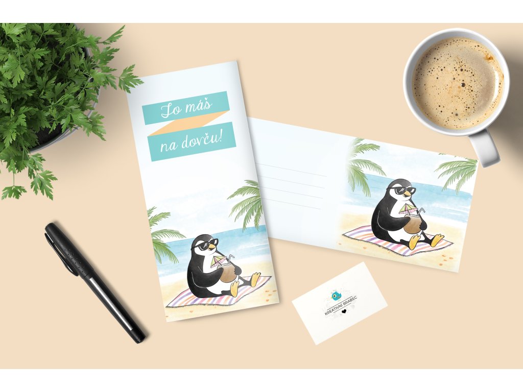 Ručně malované přáníčko k odchodu do důchodu nebo odjezdu na dovolenou. Tištěno na kreativním papíře s kraftovou obálkou ve velikosti 15 x 15 cm.