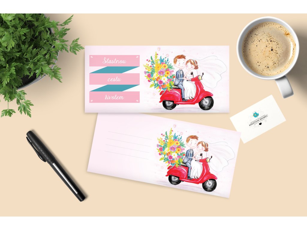 Zkuste náš jedinečný design pro ženicha a nevěstu s novomanželi na motorce Vespa a nápisem "Šťastnou cestu životem".