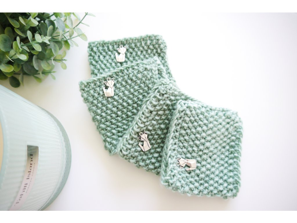 Upletený v jednoduchém vzoru s kovovou liškou a perfektně sedne na hrnek Dinera z Ikea, ale i hrnky v normální velikosti.