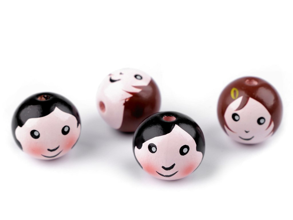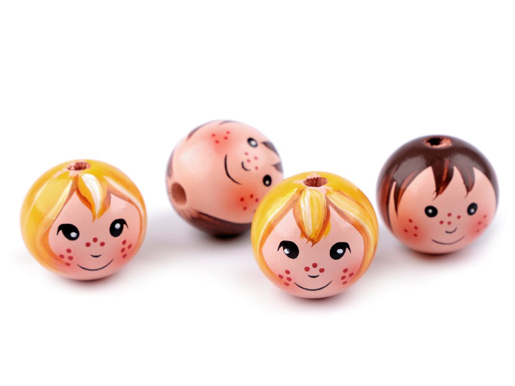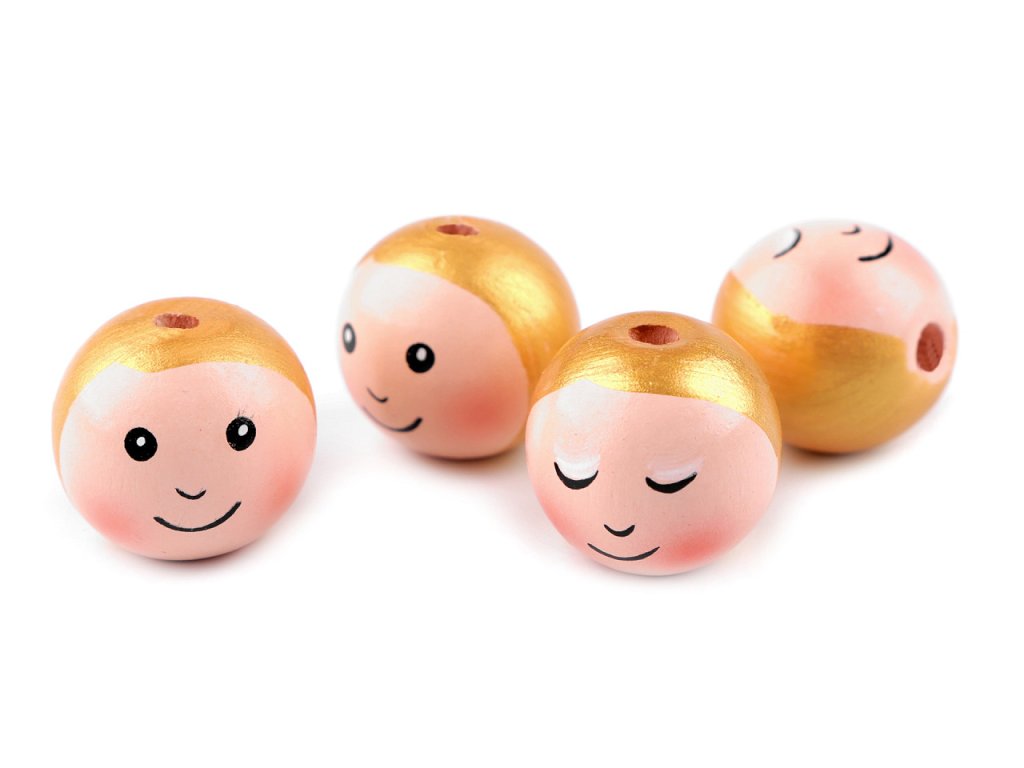 Sada dřevěných korálků s malovaným obličejem se hodí na výrobu andělů, protože mají krásně namalované zlaté vlasy. S jejich pomocí si můžete vytvořit postavičky, uháčkovat panáčky, vytvořit veselý náhrdelník, vyrobit prstové maňásky, zápichy do květináče apod.Díky malbě se od sebe jednotlivé korálky mohou lišit. Vzhledem k technologii zpracování dřeva mohou být okolo průvleků otřepky.