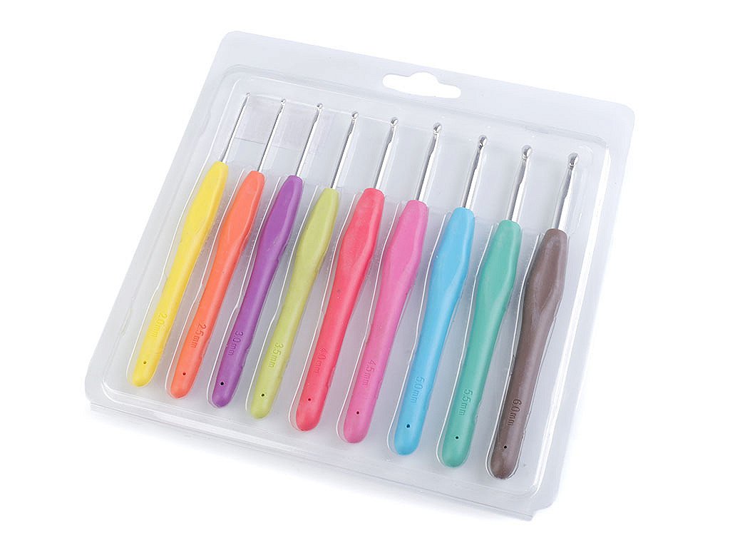 Sadu háčků na háčkování ocení každá žena, která ráda háčkuje. Díky silikonové rukojeti se pohodlně drží v ruce.Sada obsahuje 9 háčků následujících velikostí: 2; 2,5; 3; 3,5; 4; 4,5; 5; 5,5; 6 mm.