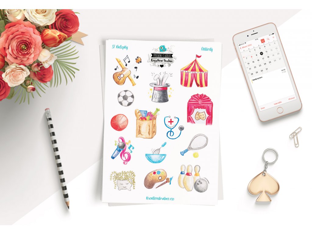 Arch A5 s 14 samolepkami s tématem aktivit a kroužků. Vytvořen s láskou pro vaše další tvoření a plánování. Osvěžte si diář samolepkami nebo podtrhněte fotky ve fotoalbu tematickými obrázky.