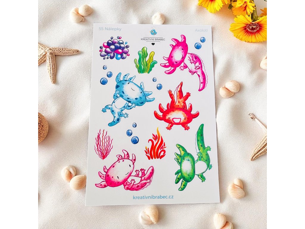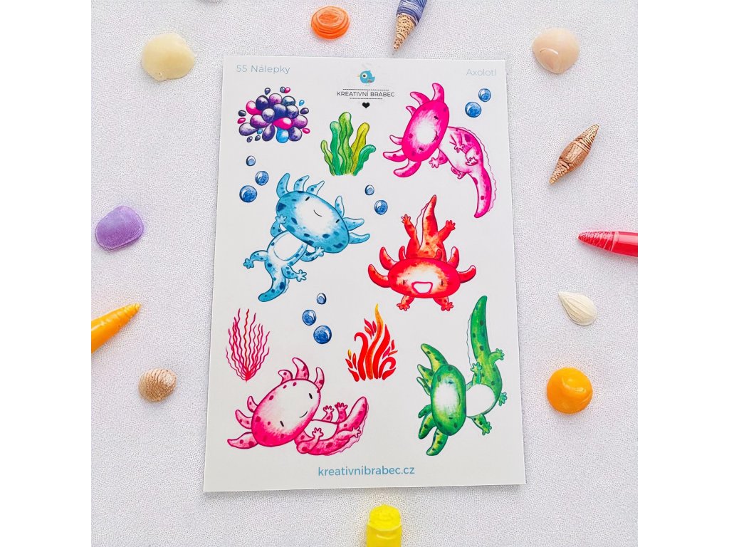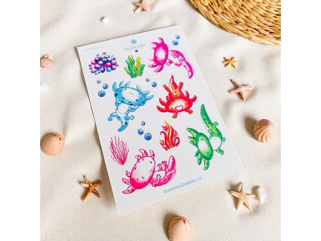 Arch A5 s 13 samolepkami s tématem axolotlů. Vytvořen s láskou pro vaše další tvoření a plánování. Osvěžte si diář samolepkami nebo podtrhněte fotky ve fotoalbu tematickými obrázky.