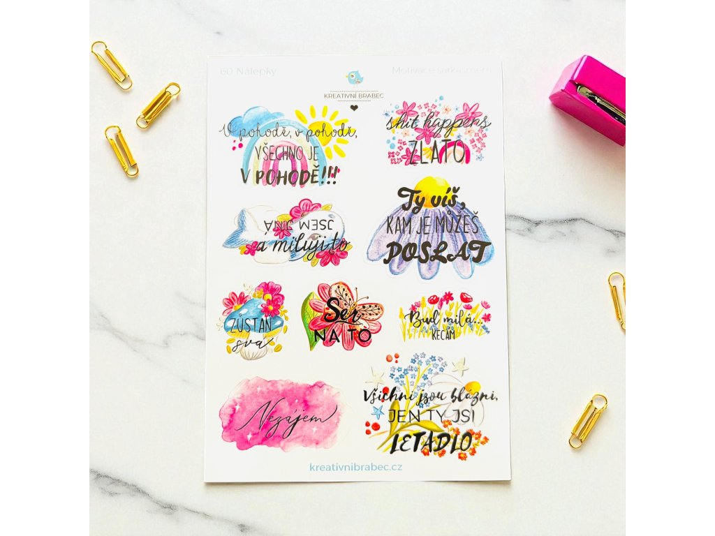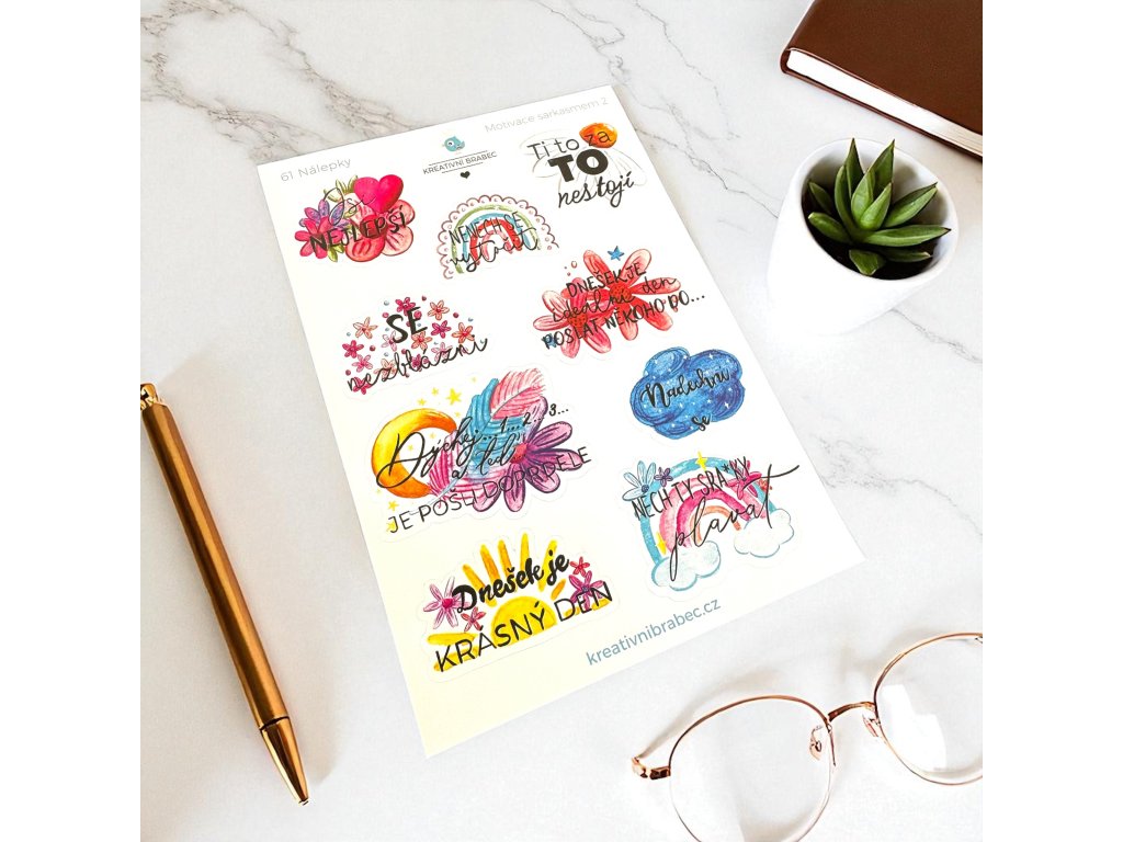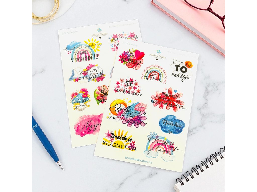 Archy A5 s 9 a 9 samolepkami s motivačními citáty na ruby pro uvolnění. Vytvořen s láskou pro vaše další tvoření a plánování. Osvěžte si diář samolepkami nebo podtrhněte fotky ve fotoalbu tematickými obrázky.