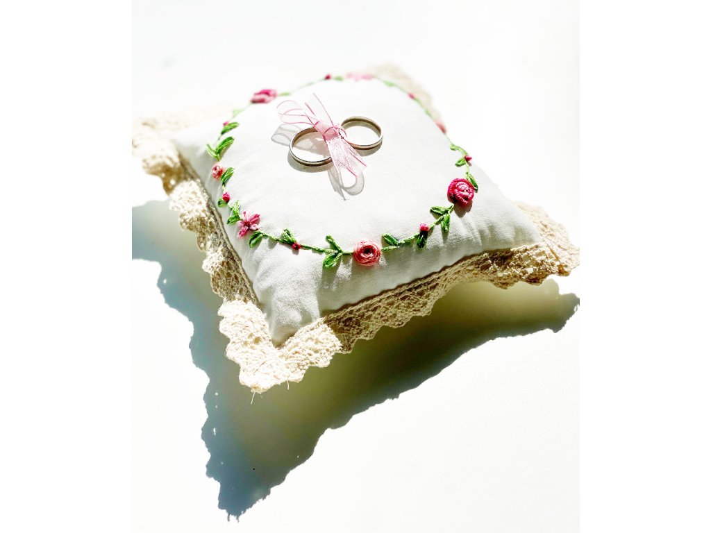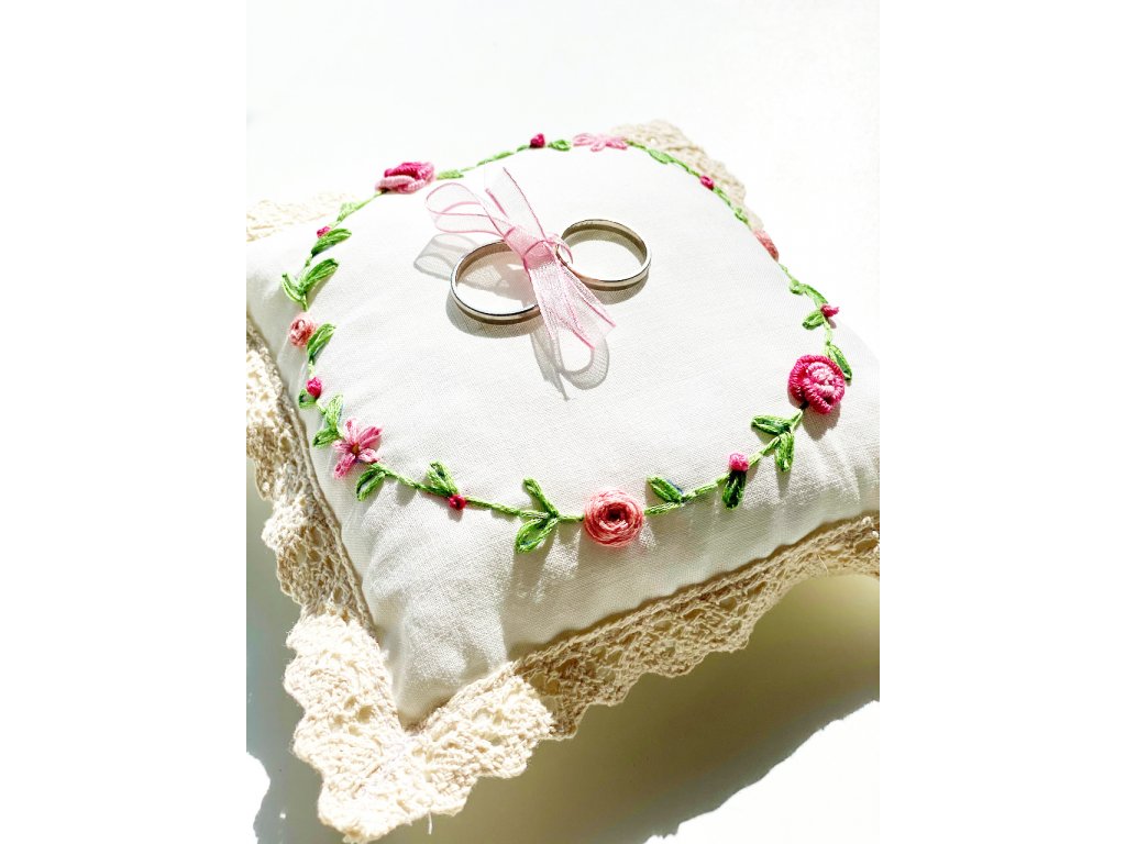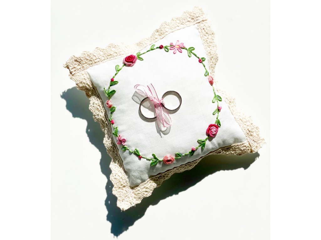 Nádherný ručně vyšívaný polštářek pod prstýnky. Výšivku tvoří kvítky růží v melírovaných růžových odstínech a jemné růžové kopretiny.