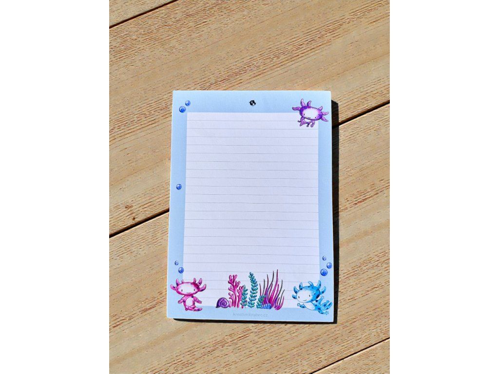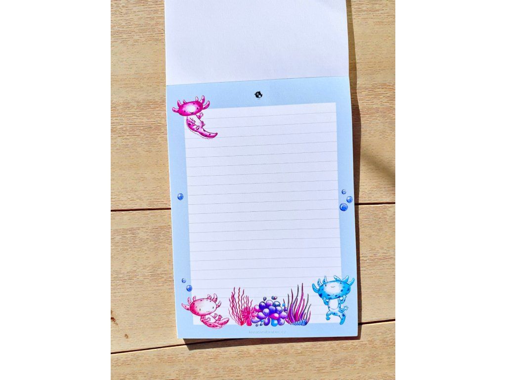 Axolotlové jsou jedni z nejroztomilejších tvorů na světě – a v tomto bločku vám budou dělat společnost při každém zápisku. Psaní poznámek tak bude o něco zábavnější.
