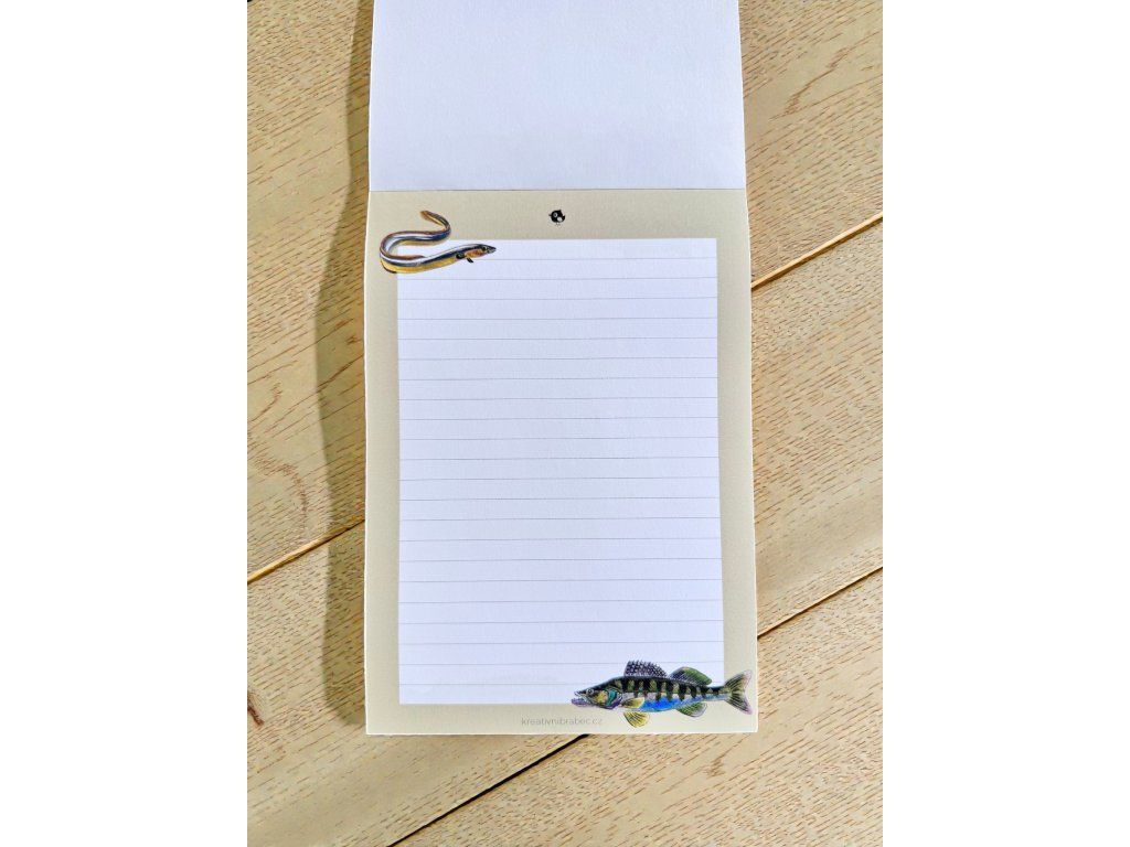 Praktický trhací bloček s ilustracemi českých ryb potěší všechny milovníky rybolovu, přírody a vodních dobrodružství. Každý list doplňují ručně kreslené ilustrace ryb, které vykukují z rohů stránky a dělají společnost vašim poznámkám.