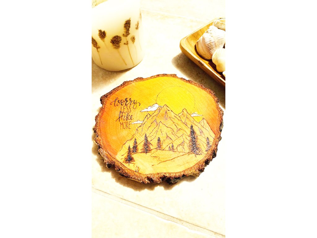 Dech beroucí výhledy na hory prostě neomrzí a odjet na ně a procházet, hikovat a šplhat na ně je neuvěřitelný balzám na psychiku. Pořiďte si domů obrázek, který vám to bude vždy připomínat a vyhánět vás nebo toho, koho víte, že takový obrázek potěší, na výlety a do hor. \n \nRučně vypalovaný obrázek hor vybarvený watercolor metodou s nápisem "Worry less, hike more" (Méně se stresuj, choď více do hor) na březovém kolečku o průměru 15 - 17 cm (užší strana 15 cm, delší cca 17 cm). \n \nZezadu je kolečko opatřeno zlatým háčkem na zavěšení. Pyrografika na dřevě je ošetřena lazurou na dřevo. \n \nTloušťka kolečka je cca 2 cm. \n \nZacházet jako s obrázkem, nejedná se o prkénko:)Buďte první, kdo napíše příspěvek k této položce.